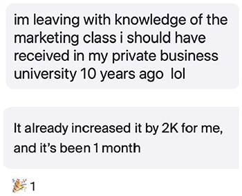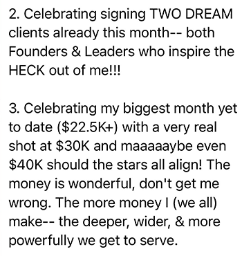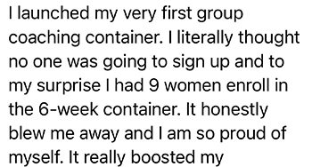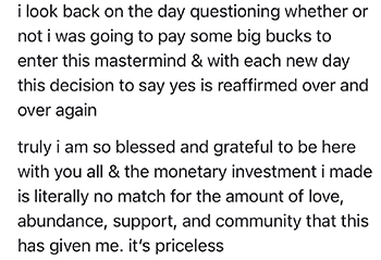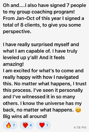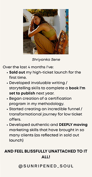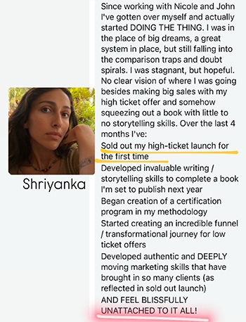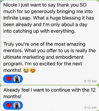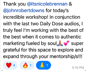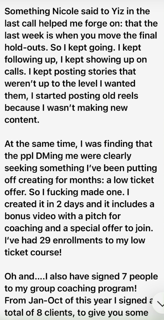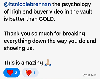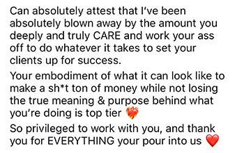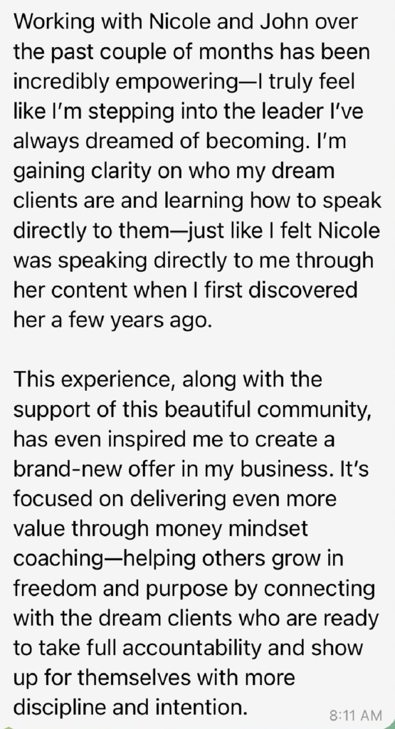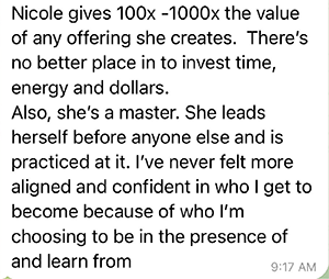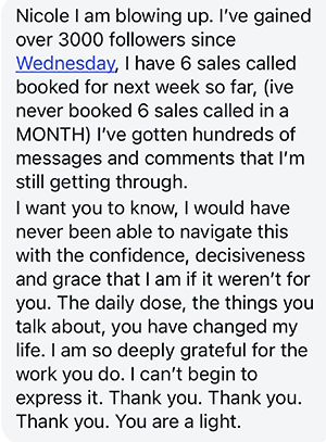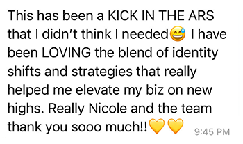 - Messaging Workshops: On these calls, you’ll bring your content and marketing to be live edited by our messaging genius, Nicole, so you can see in REAL TIME how to improve your copy, implement it right away, and see premium buyers in your DMs within 24 hours asking to sign up.