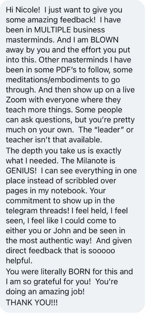 All Access Pass to all Nicole’s current and future programs for the length of your time inside the mastermind